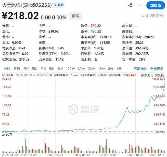 经统计,2025年全年,天普股份股价累计涨超1600%,与上纬新材一并成为全年唯二累计涨幅超十倍的个股。截至2025年12月31日收盘,该股报收218.02元/股,总市值292.32亿元。