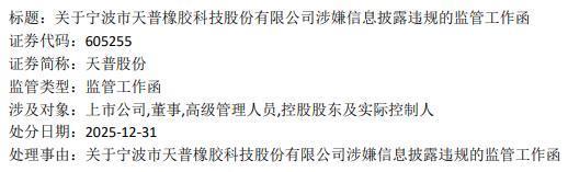 2025年12月31日,根据上交所发布的公告,天普股份因涉嫌信息披露违规收到了监管工作函。该函涉及的对象包括上市公司本身、董事、高级管理人员、控股股东及实际控制人。